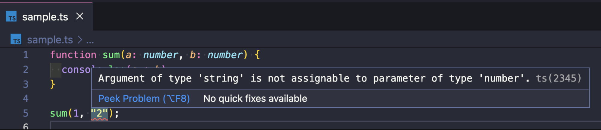 sum(1, "2"); //Argument of type 'string' is not assignable to parameter of type 'number'.