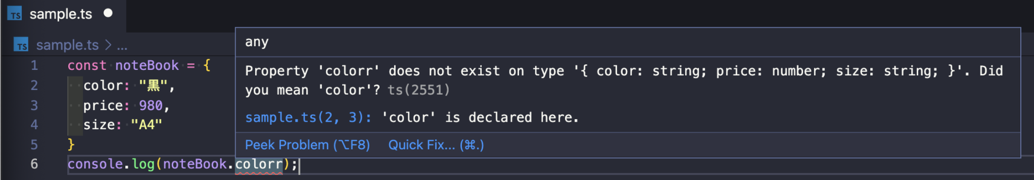 エラーとしては、type '{ color: string; price: number; size: string; }' にはプロパティ 'colorr' が存在しません。colorのことでしょうか? と出力してくれています。