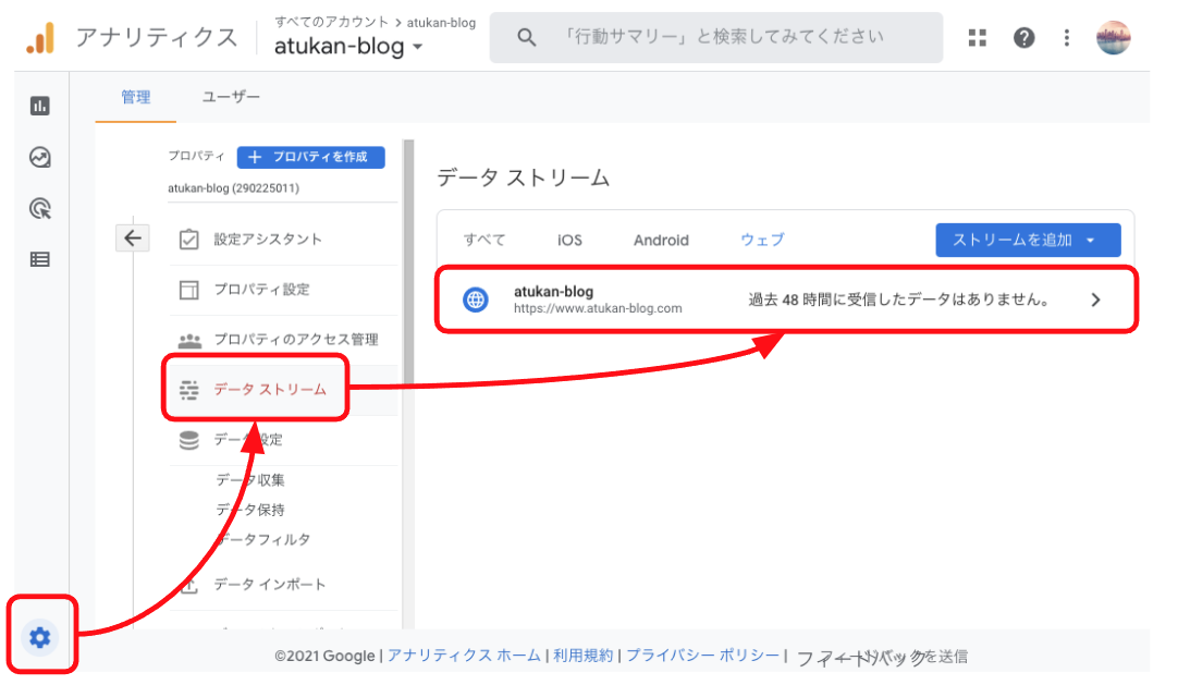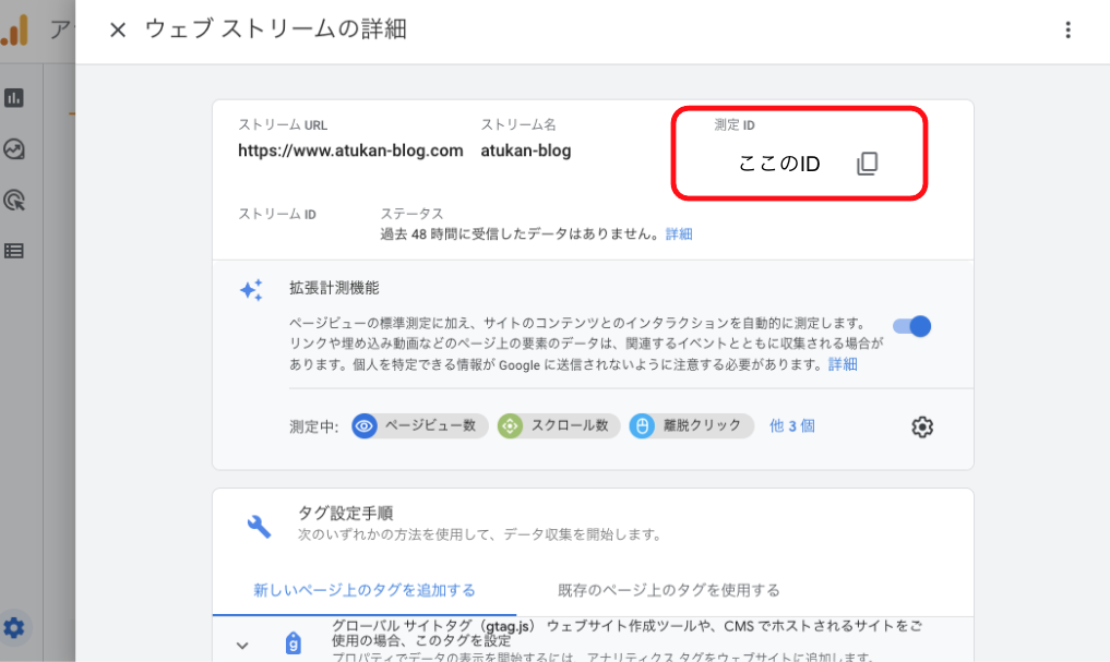 - 設定→データストリーム→ウェブタグを選択して該当箇所をクリック