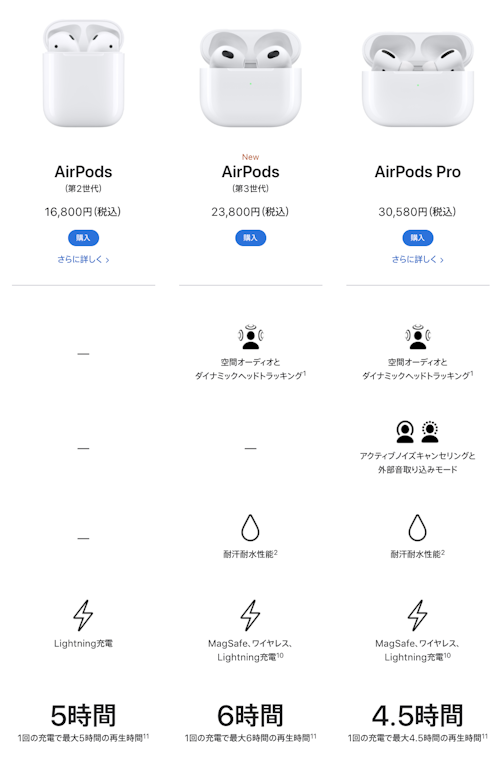 第2世代から変わった点は、「空間オーディオ」と「ダイナミックヘッドトラッキング」が搭載されて音を楽しむエンタメ力が向上したのと、バッテリー駆動時間、耐水性能が向上した点でしょうか。